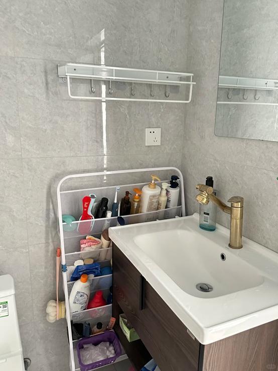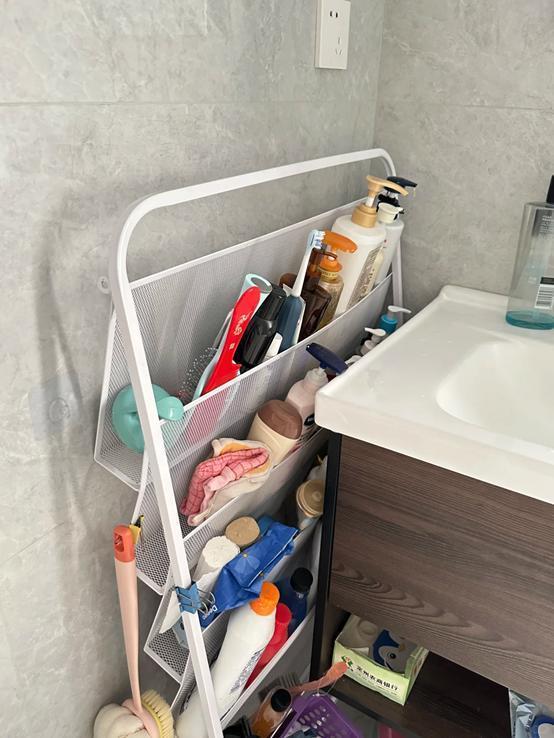 将绘本架直接放在洗手台旁边的空地上,在卫生间里面的瓶瓶罐罐直接放在绘本架上面,也会让整个卫生间都变得规整很多,大家也可以试一试。